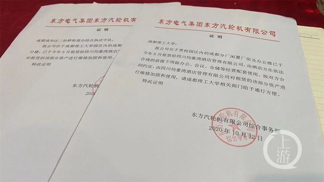 2020年10月12日,东方汽轮机有限公司综合事务部出具证明给成都理工大学和当地二仙桥街道办事处,确认了东汽公司已经将成都理工校内的厂房、办公楼租赁给了均豪湾酒店,希望成都理工大学能够对均豪湾酒店给予通行方便。东汽公司相关工作人员在接受四川广播电视台采访时表示,厂房的产权在东汽公司毫无疑问,相关租赁手续也是合法合规,“根据国资委规定,闲置资产必须要加以利用”。出于对学校管理的尊重,东汽公司也和理工大学进行过沟通,“告诉过理工大学我们要租赁厂房,校方也同意在不影响校园管理的情况下出租,毕竟是我们的权属,我们肯定可以利用”。