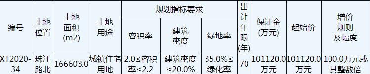 地块编号XT2020-34,地块名称XT2020-34住宅用地,出让面积16.66万平,用途为住宅用地,容积率2.2,建筑面积36.65万平,起始价10.11亿元。