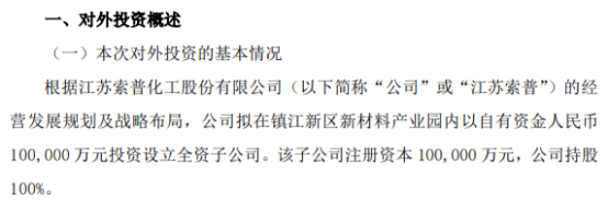 挖贝网10月11日,江苏索普600746股吧)(600746)近日发布公告,根据江苏索普化工股份有限公司(以下简称“公司”或“江苏索普”)的经营发展规划及战略布局,公司拟在镇江新区新材料产业园内以自有资金人民币100,000万元投资设立全资子公司。该子公司注册资本100,000万元,公司持股100%。
