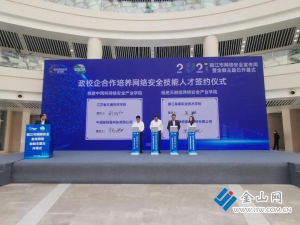 金山网讯 在10月12日举办的镇江全市网络安全宣传周开幕式上,一场特殊的签约引人瞩目:江苏省交通技师学院与中通服网盈科技有限公司、镇江高等职业技术学校与北京天融信教育科技有限公司分别开展校企合作签约,携手共建“产、学、研、用”于一体的网络安全产业学院,推进政校企合作,联合打造“入学即入企,招生即招工”网络安全技能人才培养新模式。这也是镇江市委网信办解决网络安全企业“用工难”的办实事项目。