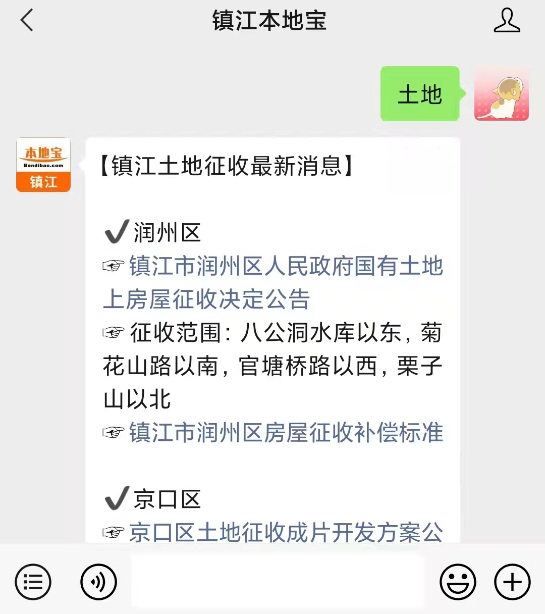 温馨提示:微信搜索公众号镇江本地宝,关注后在对话框回复【土地】可获取镇江土地征收最新消息、开发方案、征收内容等。